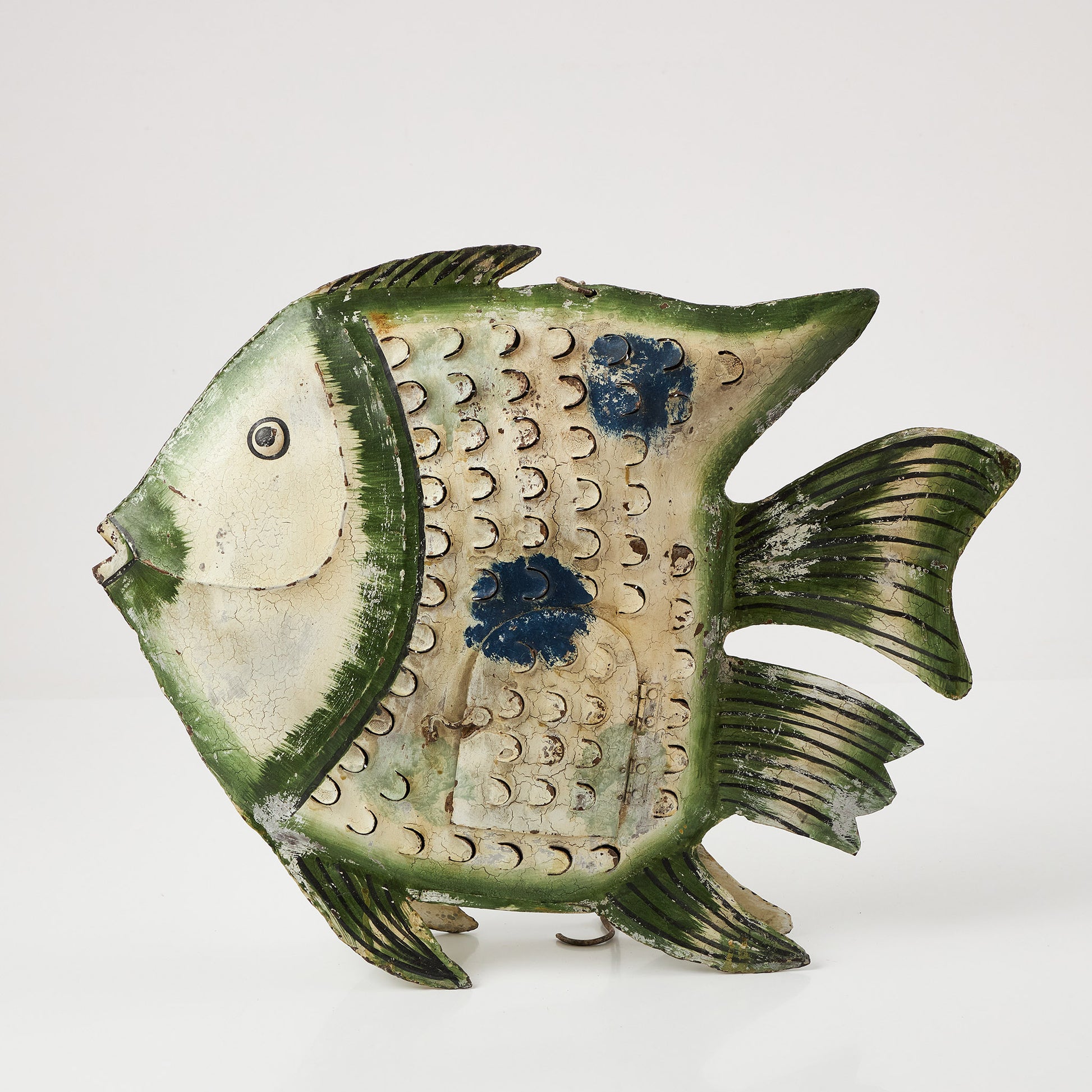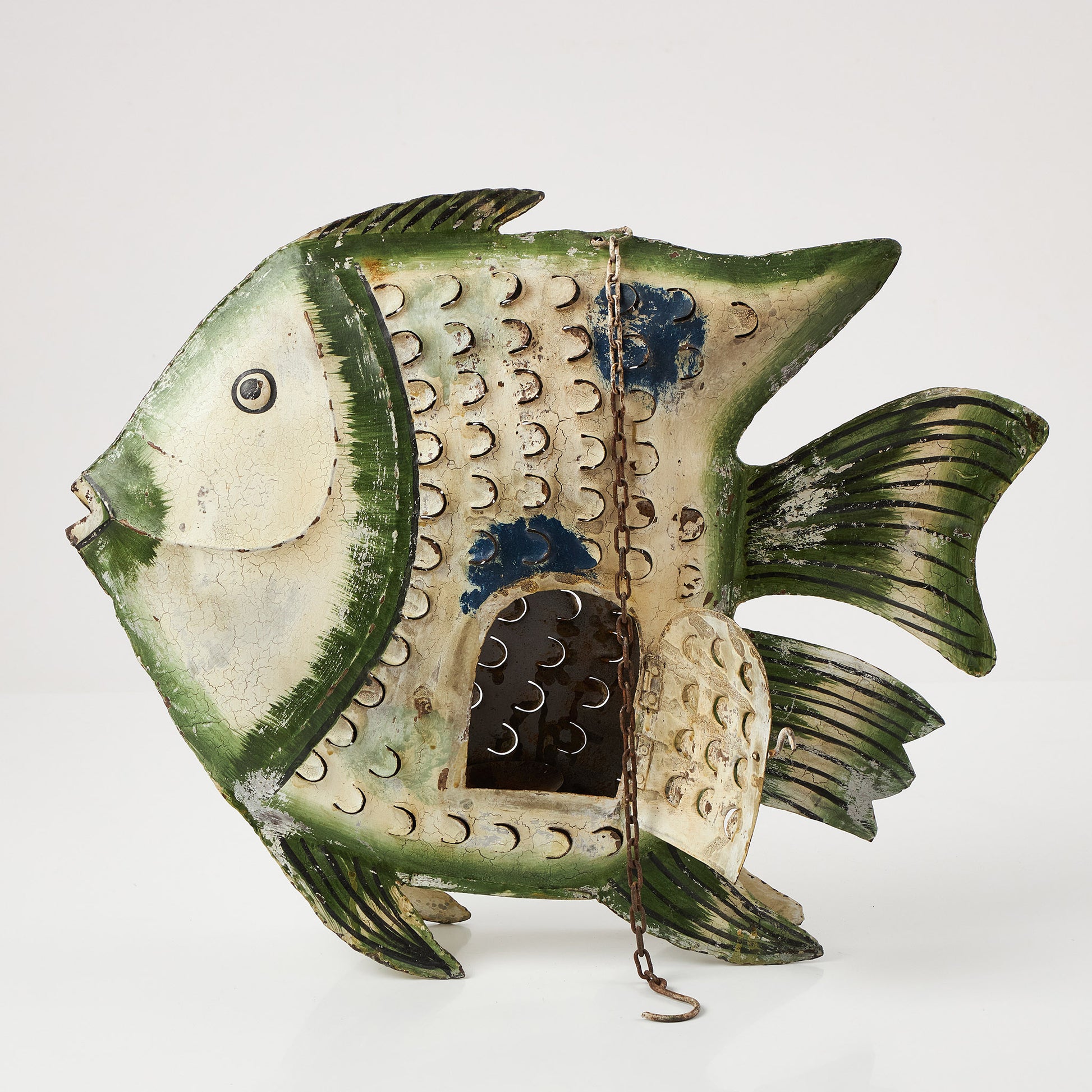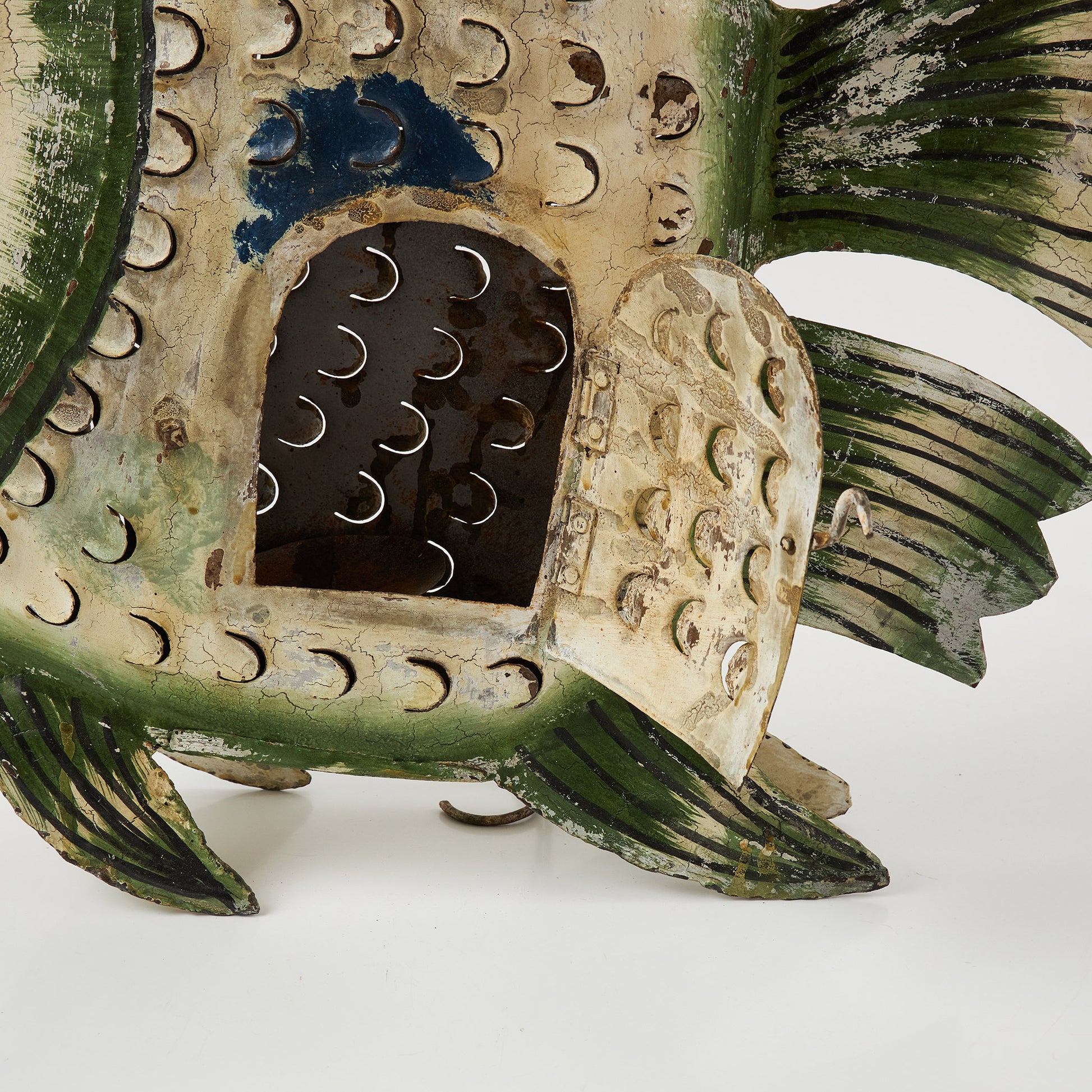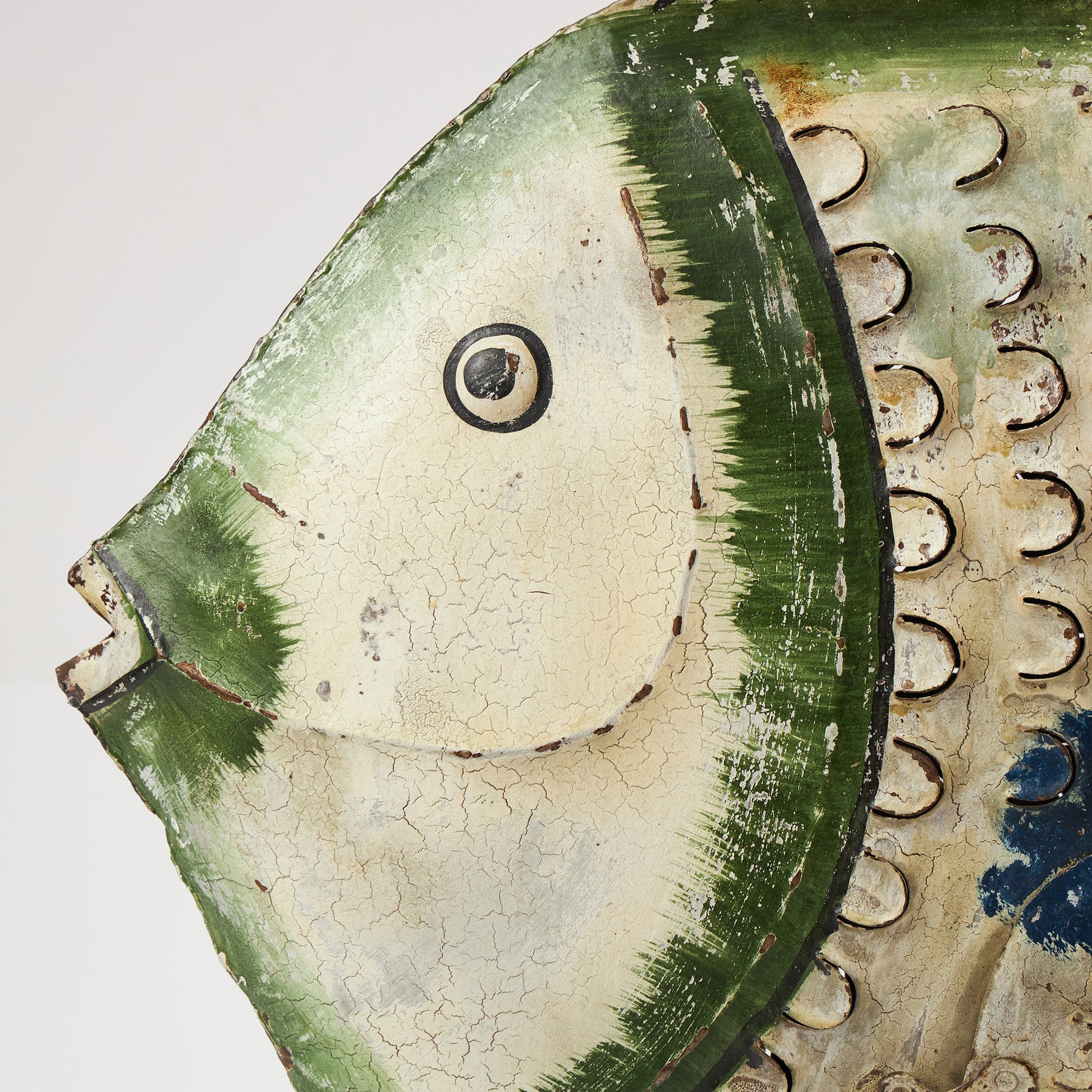 Pește decorativ din metal, pictat în nuanțe de verde și albastru, cu detalii realizate manual. În interior are spațiu special pentru așezarea unei lumânări, transformându-l într-un obiect practic și decorativ în același timp. Poate fi agățat pe perete sau așezat pe o etajeră, aducând un accent vesel și original în living, pe terasă sau în spații de vacanță.