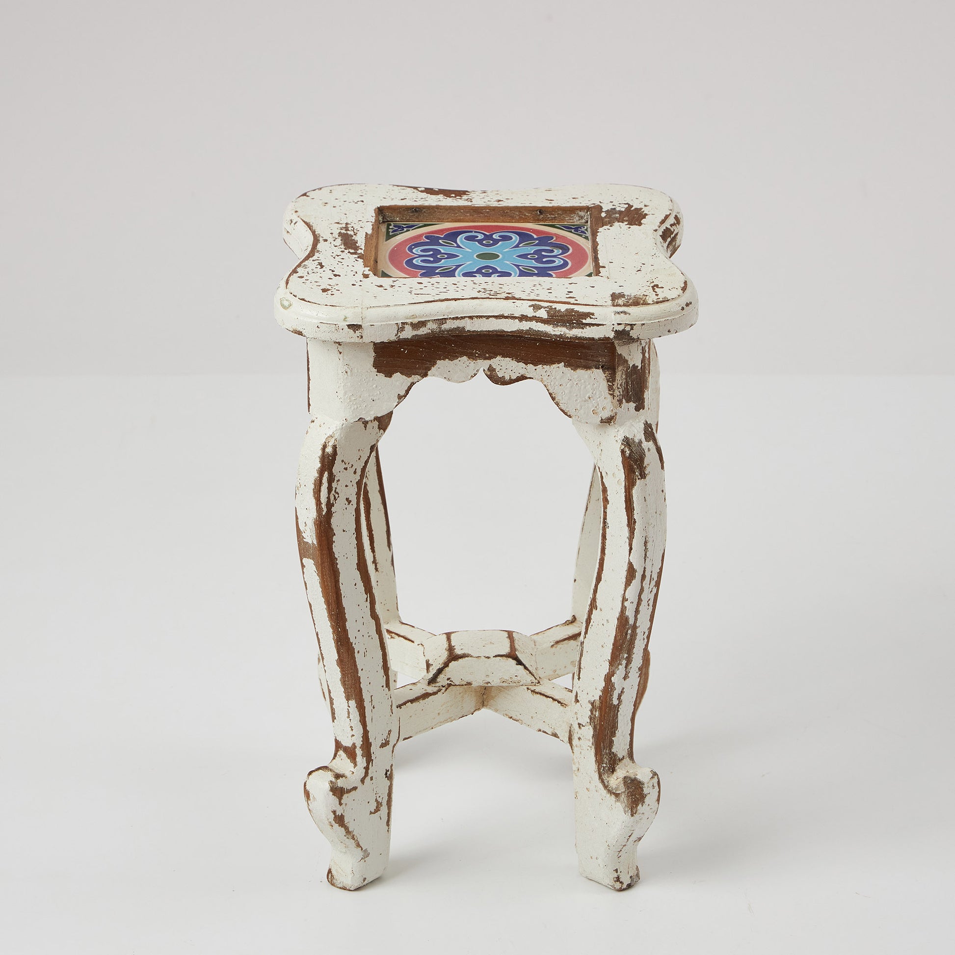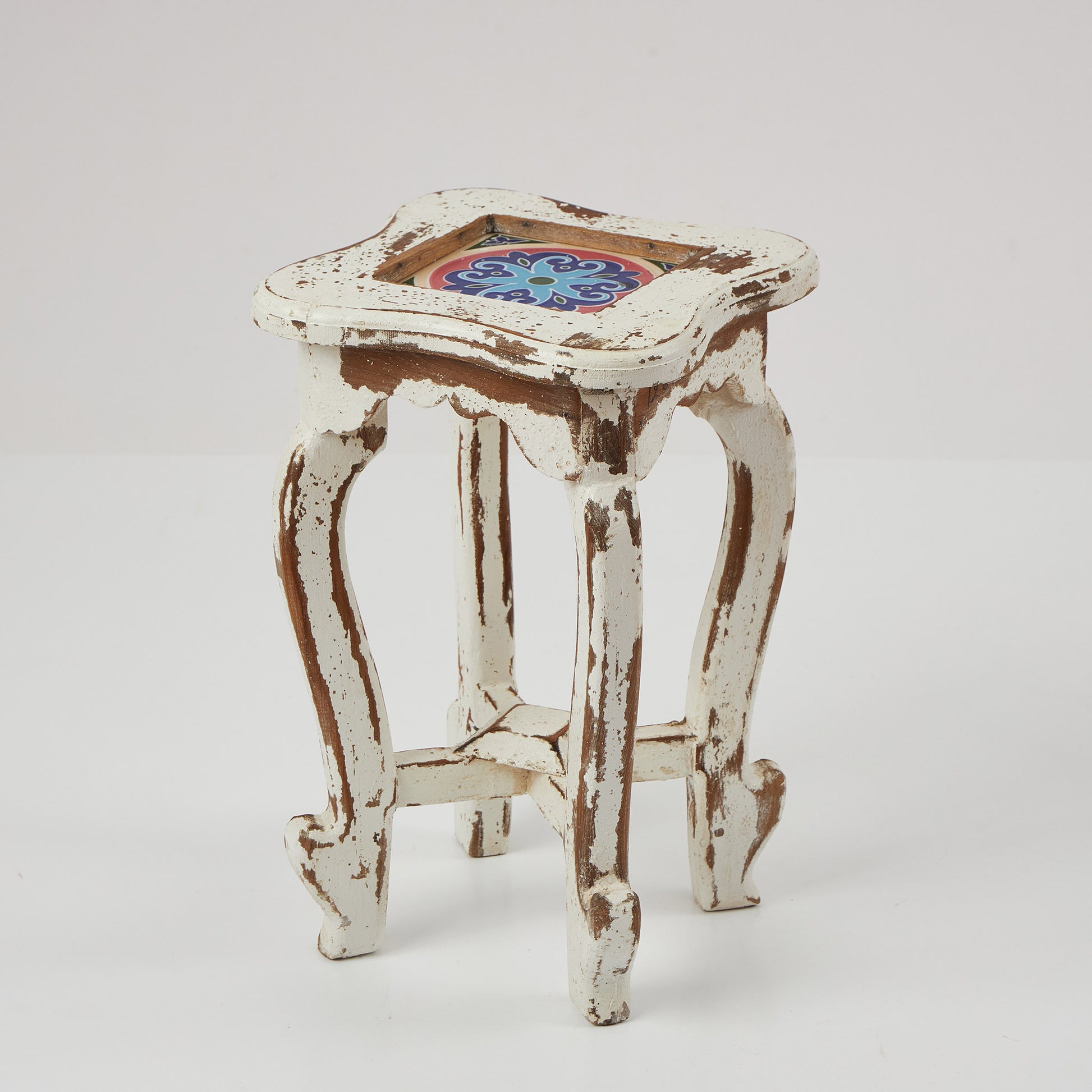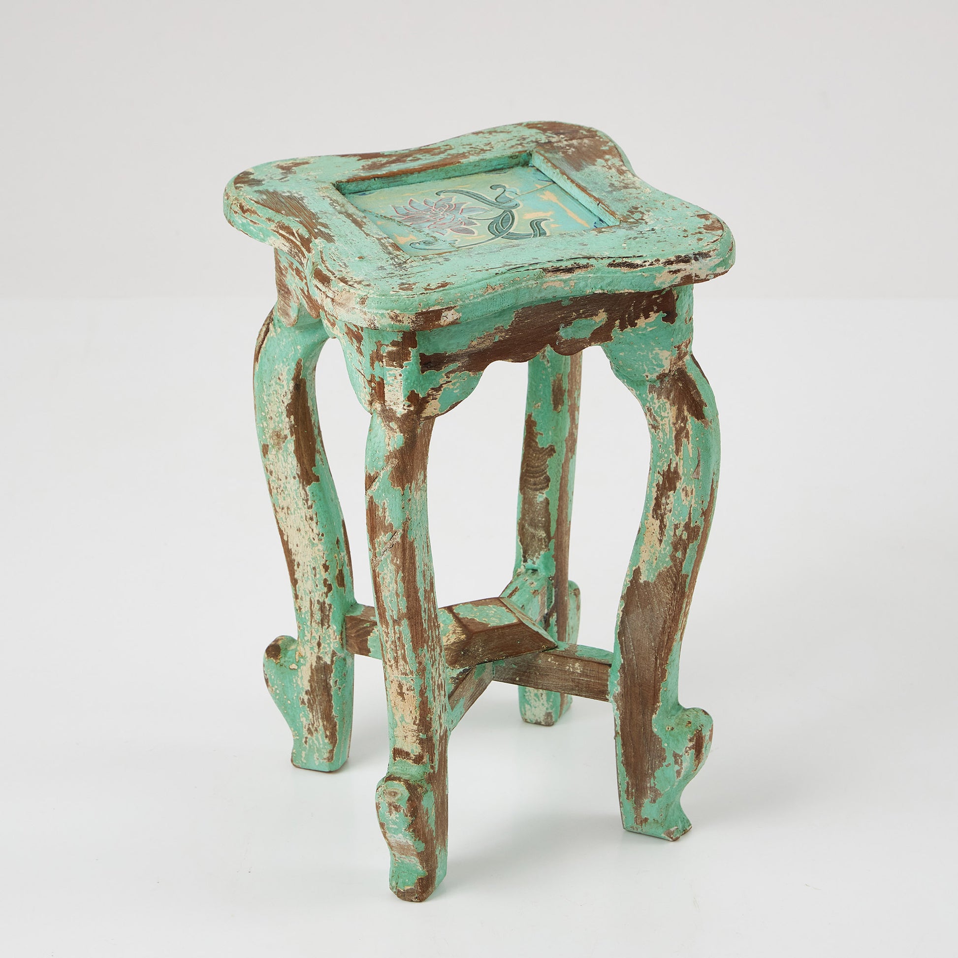 Scaun mic din lemn, cu blat pătrat și inserție de ceramică în centru. Lemnul are un finisaj antichizat, ceea ce îi dă un aspect rustic. Poate fi folosit ca taburet, ca suport pentru ghivece sau ca piesă decorativă într-un colț al casei, pe terasă sau balcon. Este o piesă practică și decorativă în același timp.