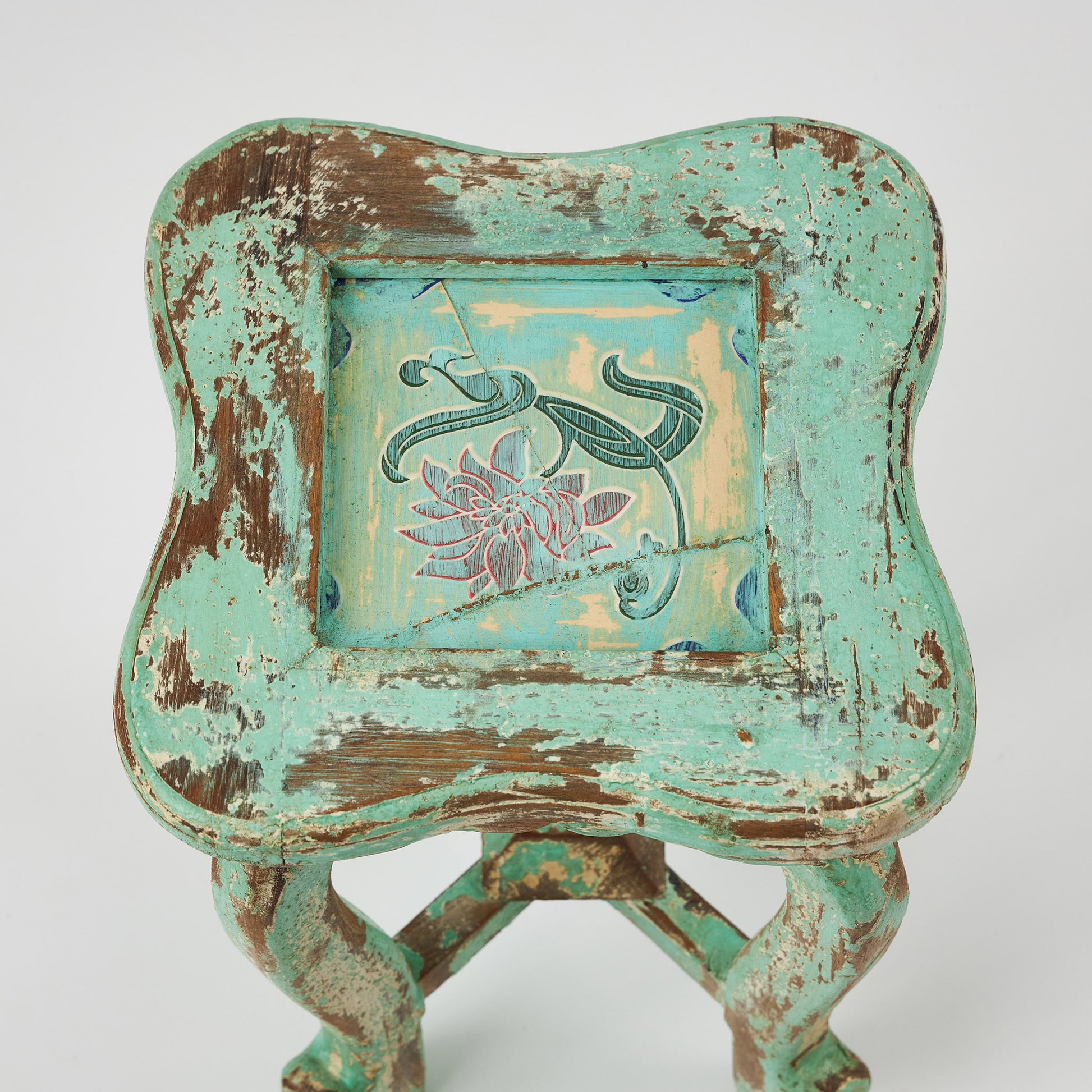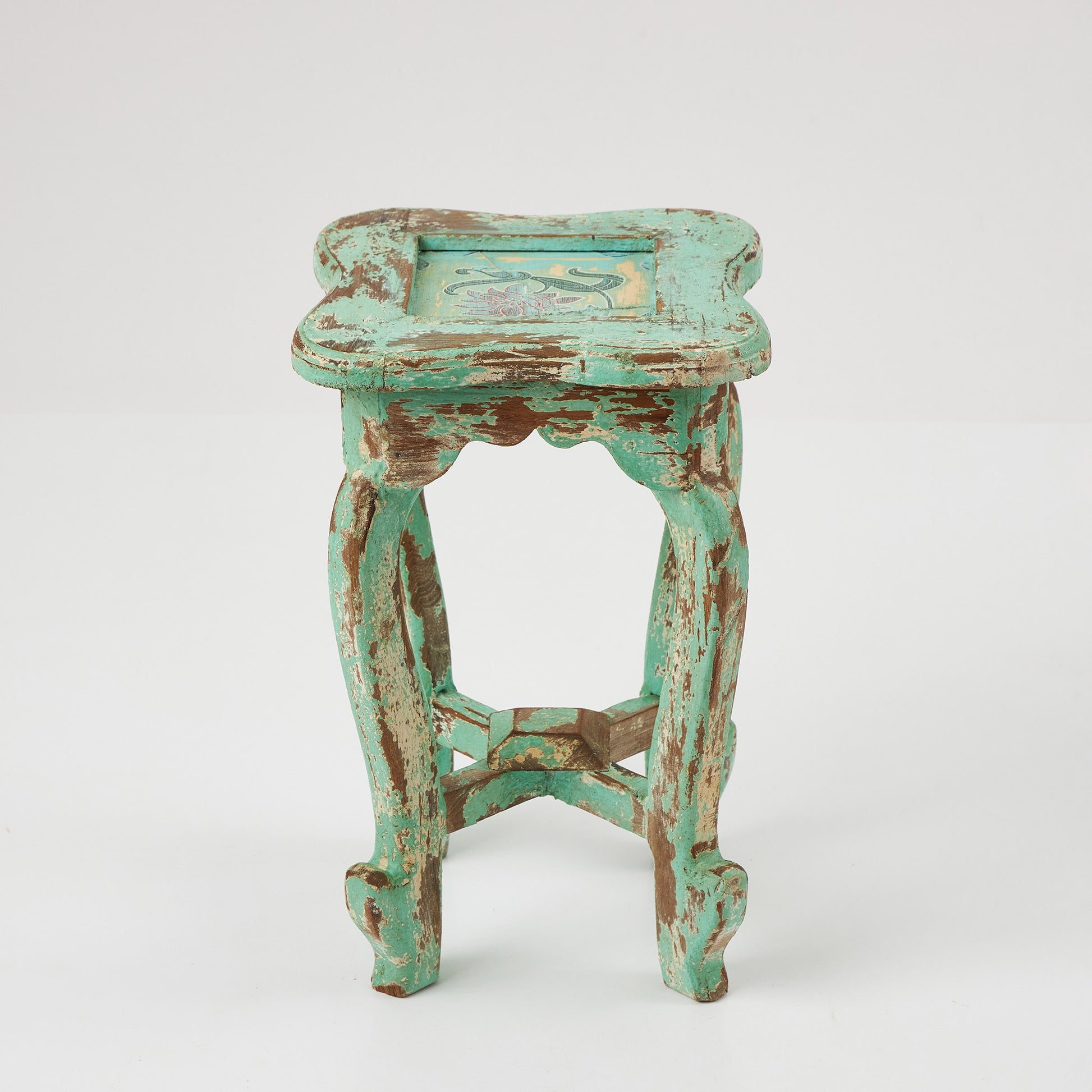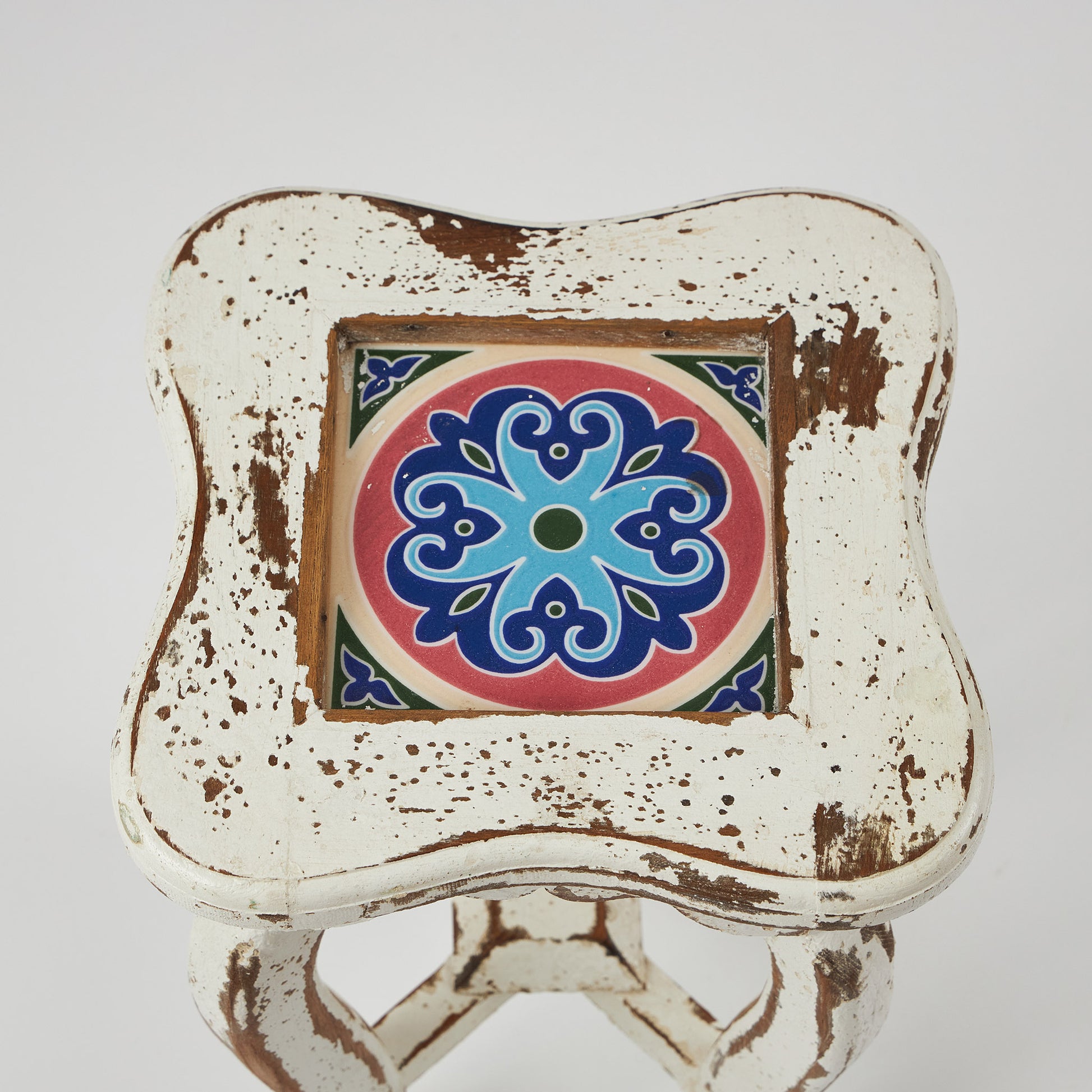 Scaun mic din lemn, cu blat pătrat și inserție de ceramică în centru. Lemnul are un finisaj antichizat, ceea ce îi dă un aspect rustic. Poate fi folosit ca taburet, ca suport pentru ghivece sau ca piesă decorativă într-un colț al casei, pe terasă sau balcon. Este o piesă practică și decorativă în același timp.
