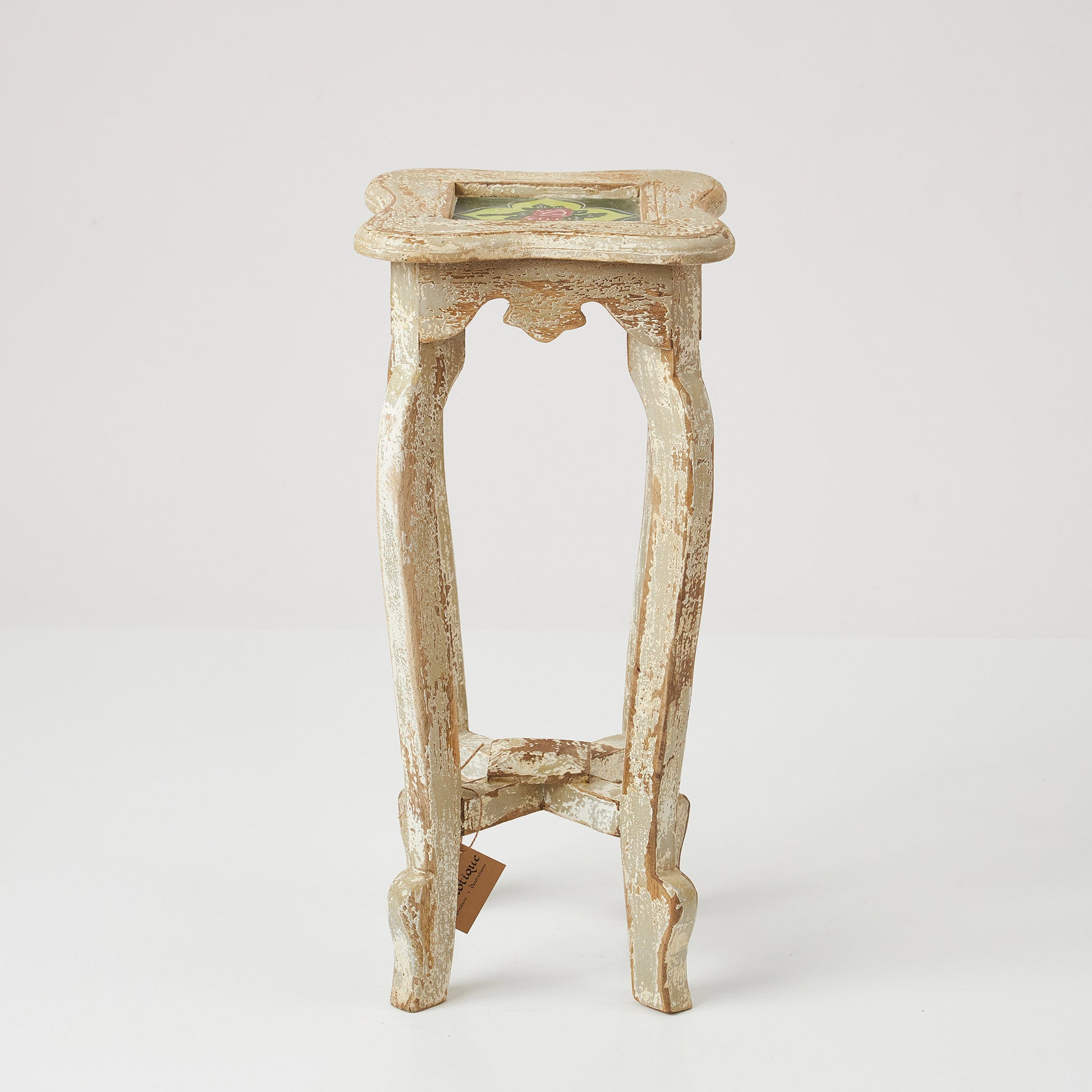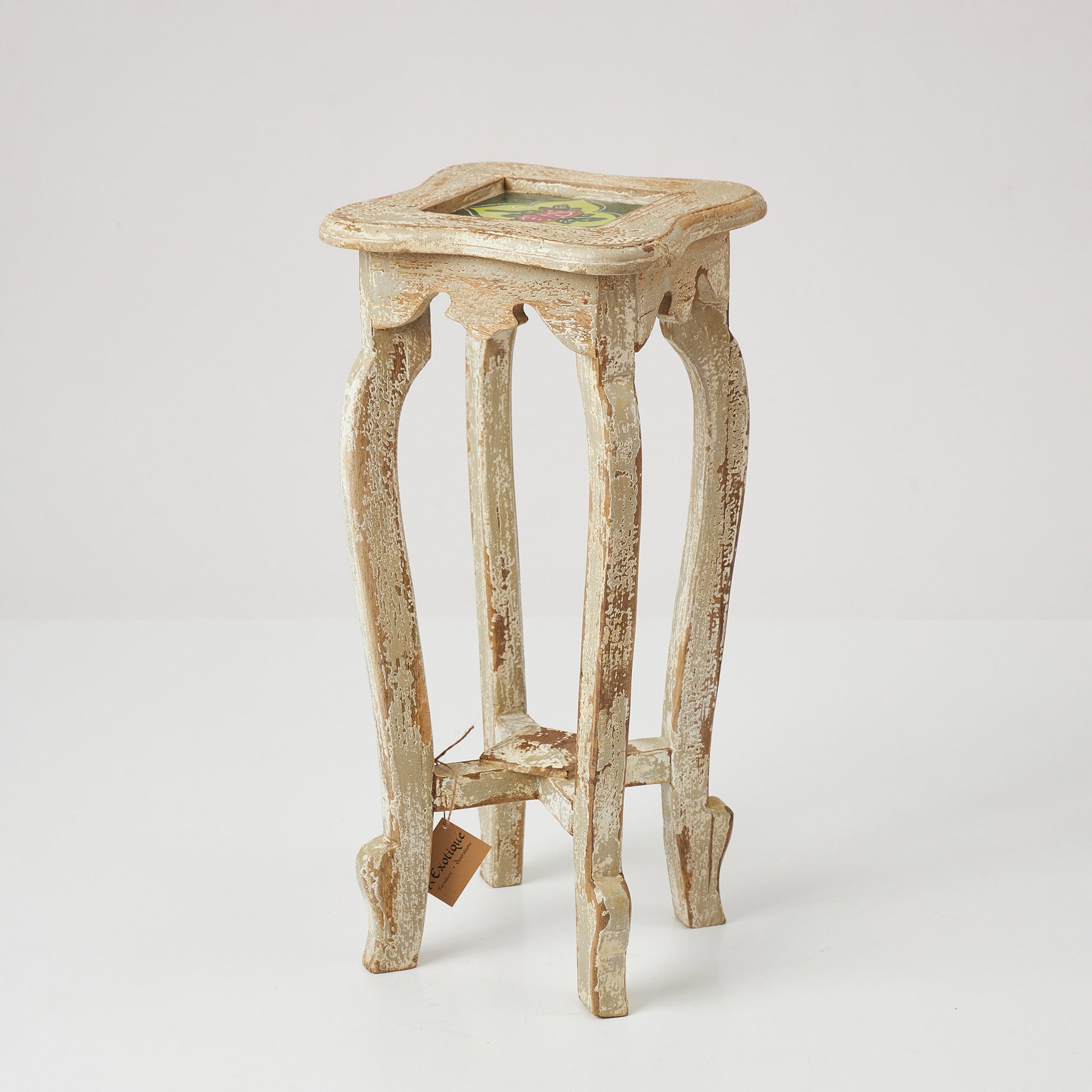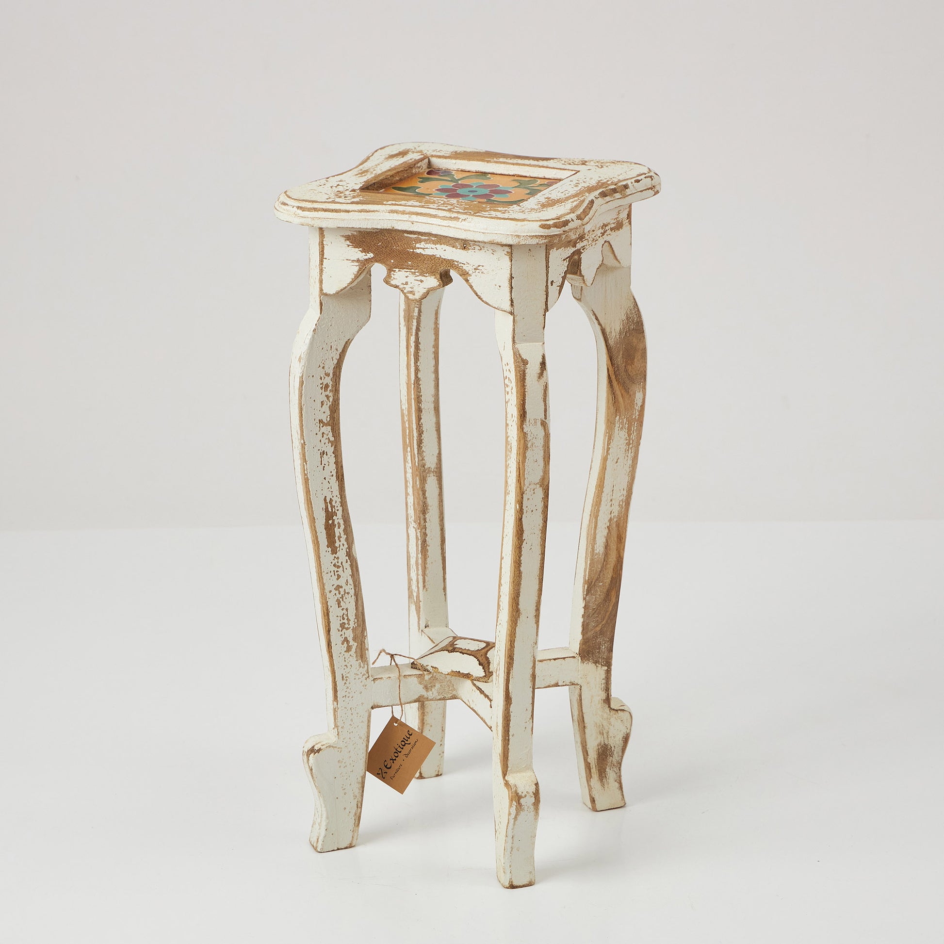 O piesă versatilă, ce poate fi folosită atât ca suport pentru plante, cât și ca măsuță decorativă. Realizată din lemn cu aspect antichizat și blat cu inserție de ceramică pictată manual, aduce un detaliu original în orice încăpere. Ideală pentru living, hol sau terasă acoperită, unde poate completa un colț de relaxare cu un accent plin de farmec.