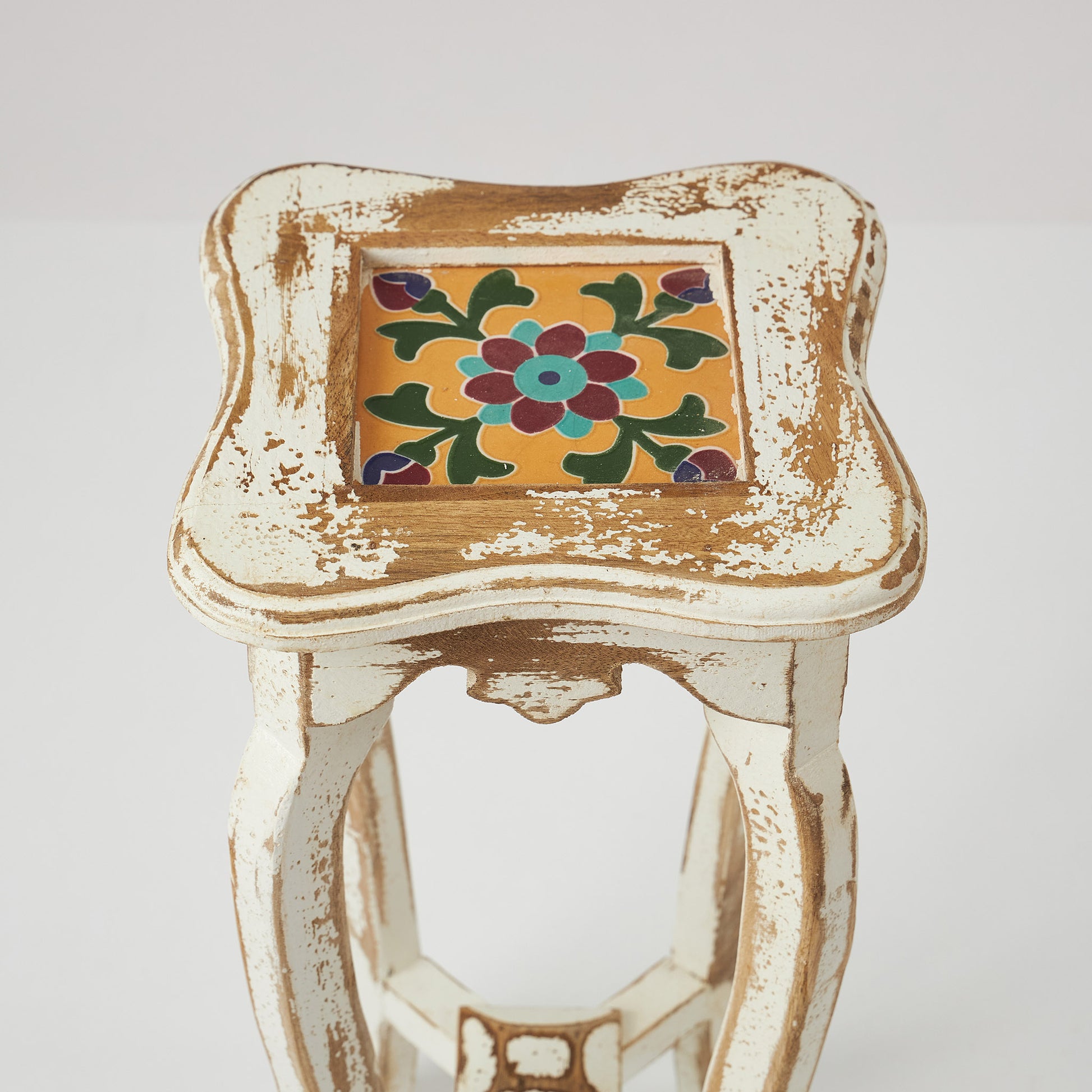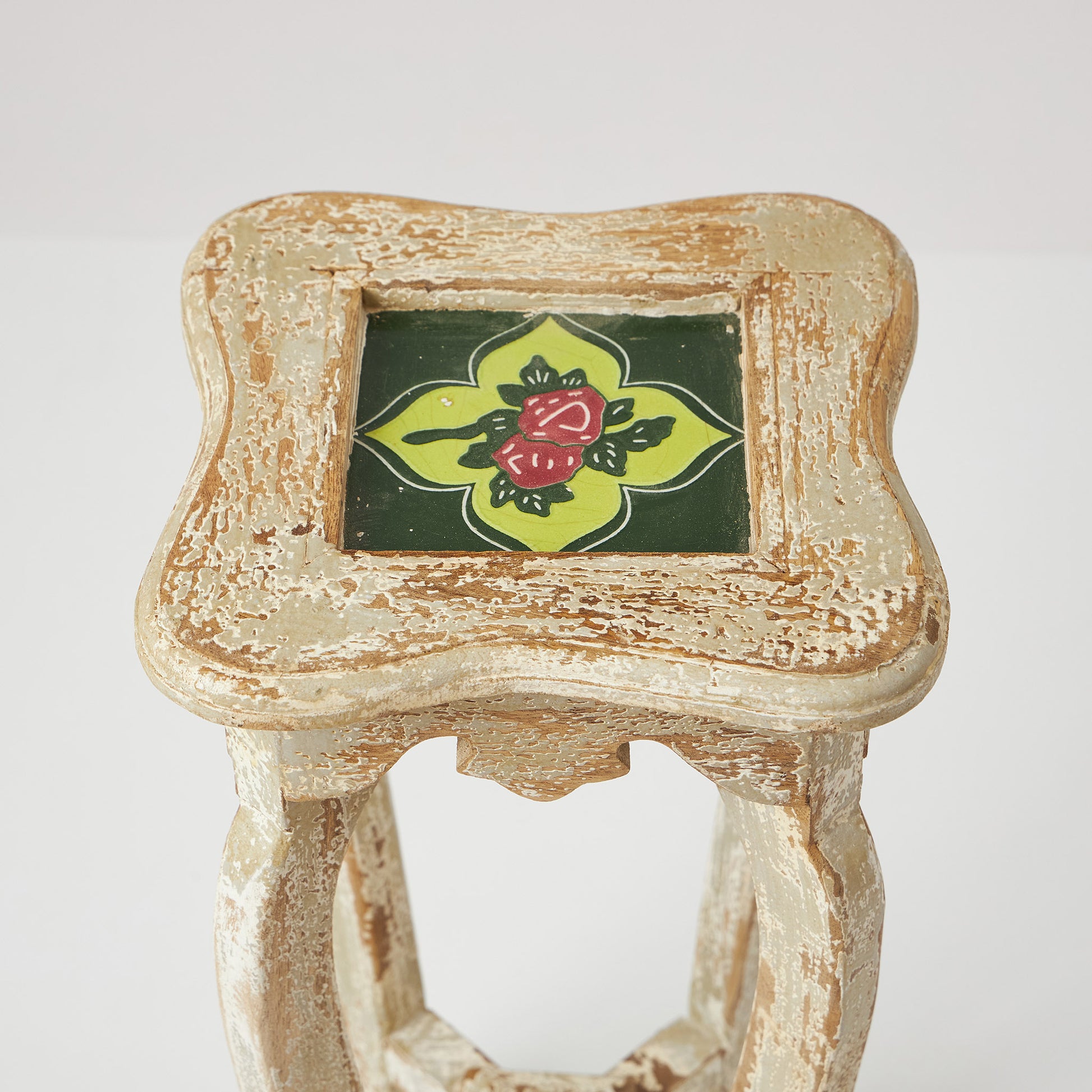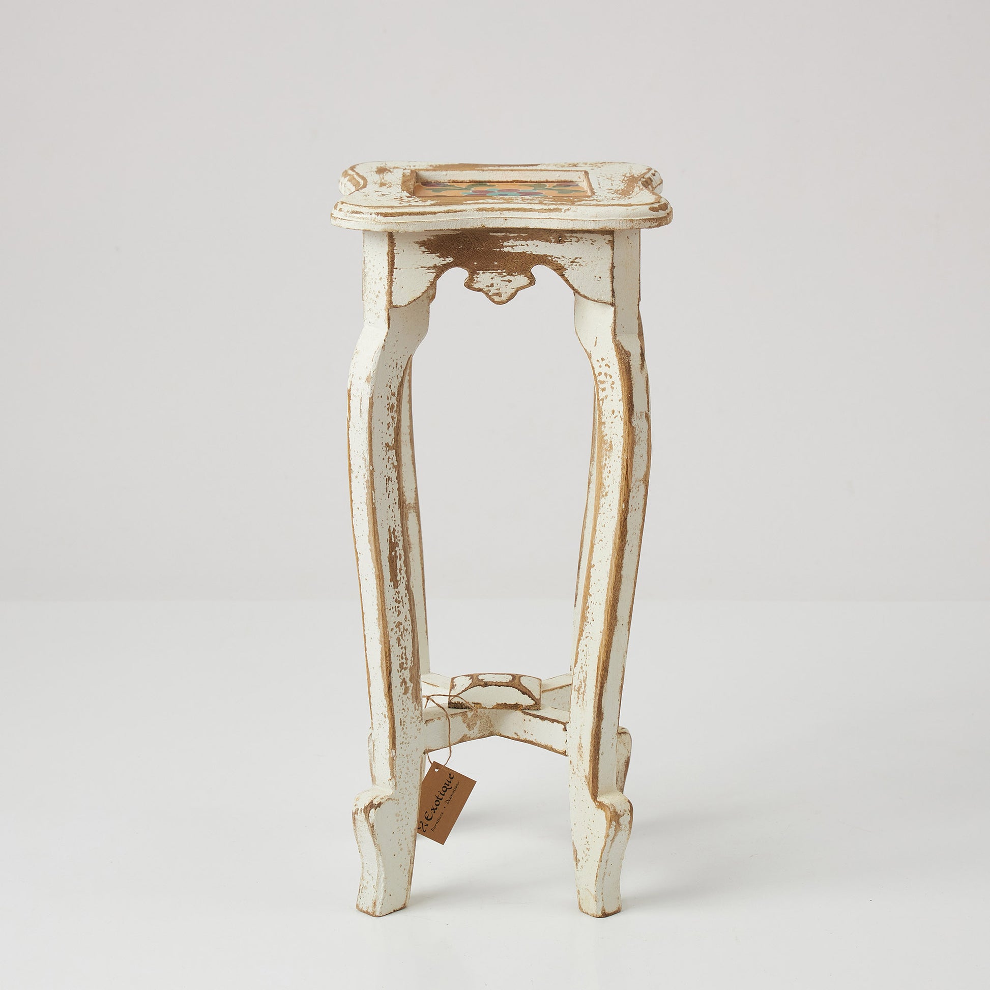 O piesă versatilă, ce poate fi folosită atât ca suport pentru plante, cât și ca măsuță decorativă. Realizată din lemn cu aspect antichizat și blat cu inserție de ceramică pictată manual, aduce un detaliu original în orice încăpere. Ideală pentru living, hol sau terasă acoperită, unde poate completa un colț de relaxare cu un accent plin de farmec.